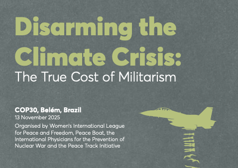 Peace Boat has released a new publication, "Disarming the Climate Crisis: The True Cost of Militarism". The report is the collective expertise of speakers at a side event held during The UN Climate Change Conference, COP30, in Belém, Brazil, at the mouth of the Amazon River. The side event Disarming the Climate Crisis: The True Cost of Militarism was organized by Peace Boat, together with the Women’s International League for Peace and Freedom, International Physicians for the Prevention of Nuclear War and Peace Track Initiative. It convened researchers, advocates and community leaders to examine how militarism accelerates climate breakdown and obstructs climate justice.